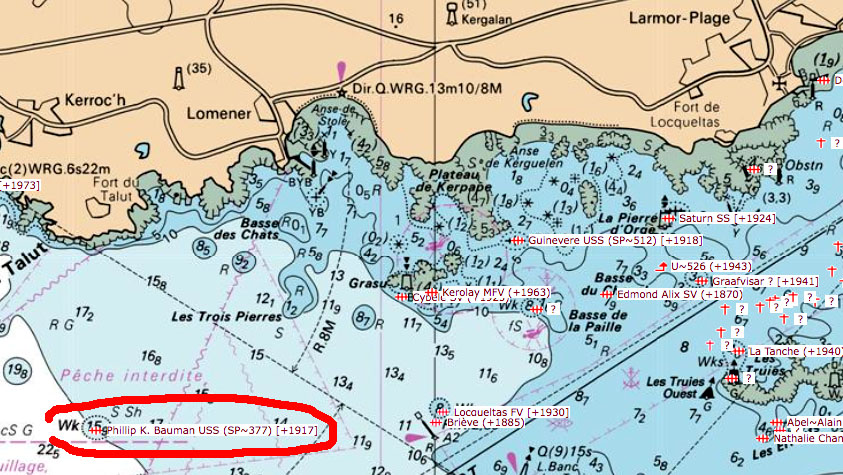 Le 12 janvier 1918, à 8 h 30, l’USS P.K. Bauman et l’USS Anderton (SP-530) quittent Bénodet pour gagner Lorient. La neige et la brume épaisse ne facilitent pas la navigation. Le commandant du Bauman ne semble pas vouloir écouter les conseils prodigués par son collègue de l’Anderton et se jette sur la roche Men an Tréas au sud-est de la pointe de Trévignon. Alerté par radio, l’Anderton se présente rapidement près du patrouilleur qui prend l’eau. Une haussière est passée entre les deux navires mais elle se rompt à la première traction. L’Anderton parvient quand même à sortir le Bauman de sa fâcheuse position. Le convoi tente de rejoindre Lorient en longeant la côte au cas où un échouage urgent serait nécessaire. La balise des Cochons est atteinte à 16 h 30 mais le remorqué, lesté de plus d’un mètre d’eau dans la salle des machines, racle le haut-fond et aggrave sa blessure. Le sort du patrouilleur est désormais scellé et, à 17 heures 15, il sombre à un mille dans le sud de la pointe du Talut tandis que l’équipage gagne le bord de l’Anderton.