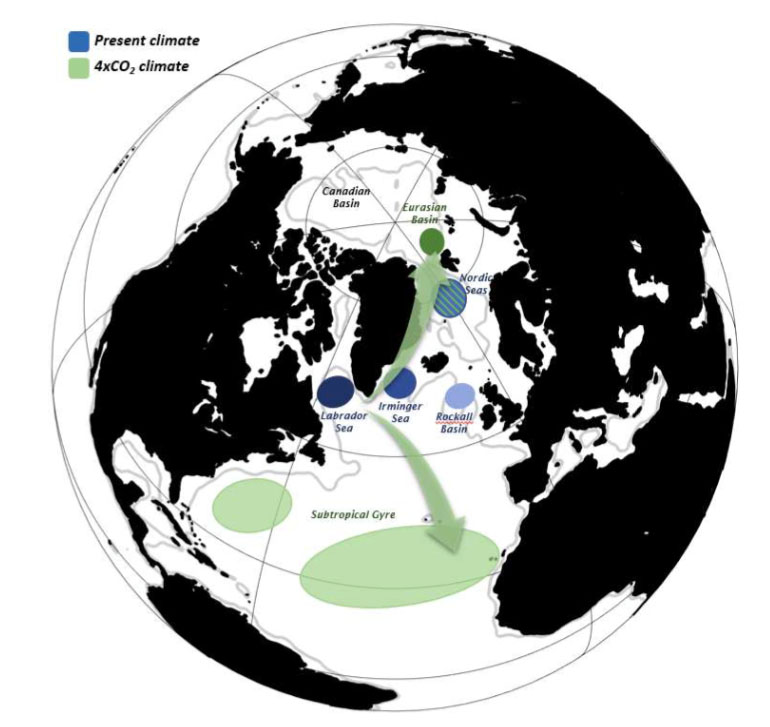 La région Atlantique Nord est un secteur crucial pour l’étude des courants marins : le courant Nord Atlantique, issu du Gulf Stream, y apporte une eau de surface plus chaude que les eaux environnantes. En se refroidissant dans cette zone subpolaire, l’eau devient plus dense. Elle finit par pénétrer en profondeur. Cette convection est l’un des piliers du « tapis roulant » océanique qui redistribue la chaleur entre les zones polaires et équatoriales, avec une forte influence sur le climat mondial.
