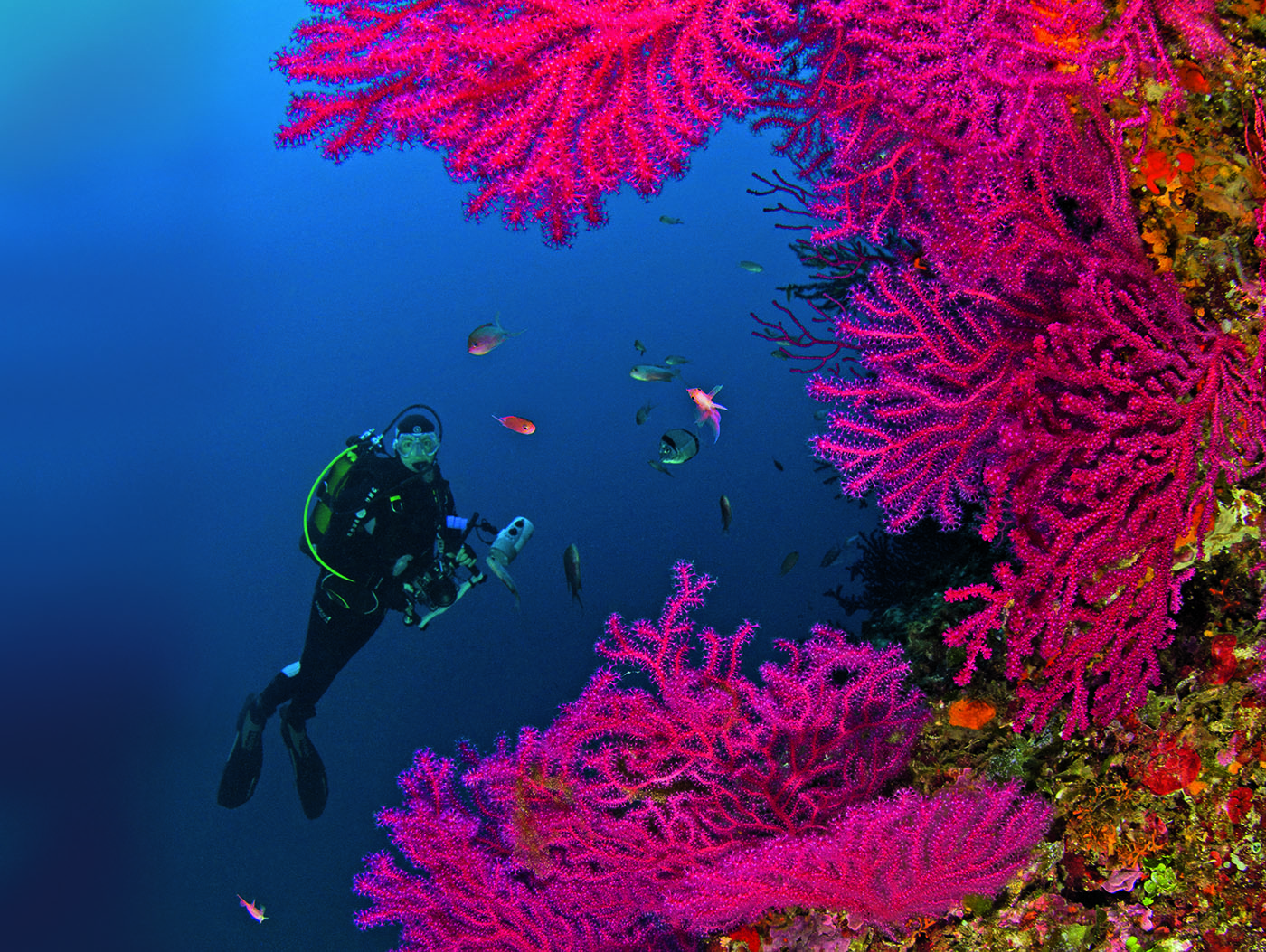 Les gorgones rouges, surtout quand elles ont des parties jaunes, colorent certaines parois comme une forêt bicolore.
